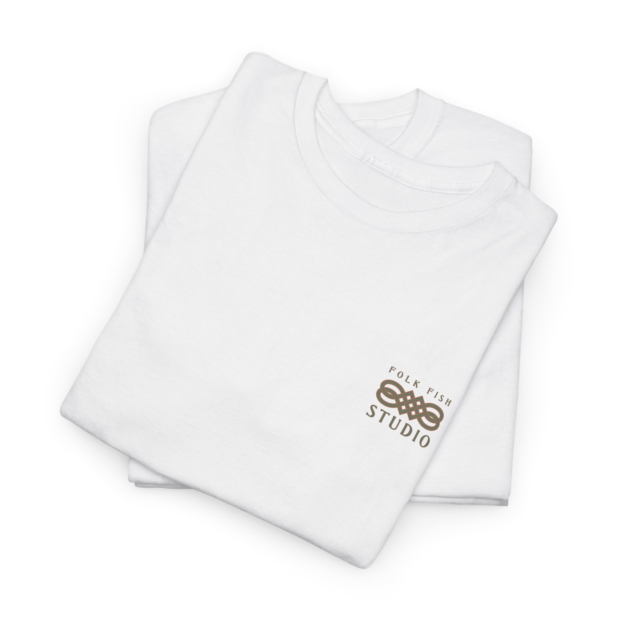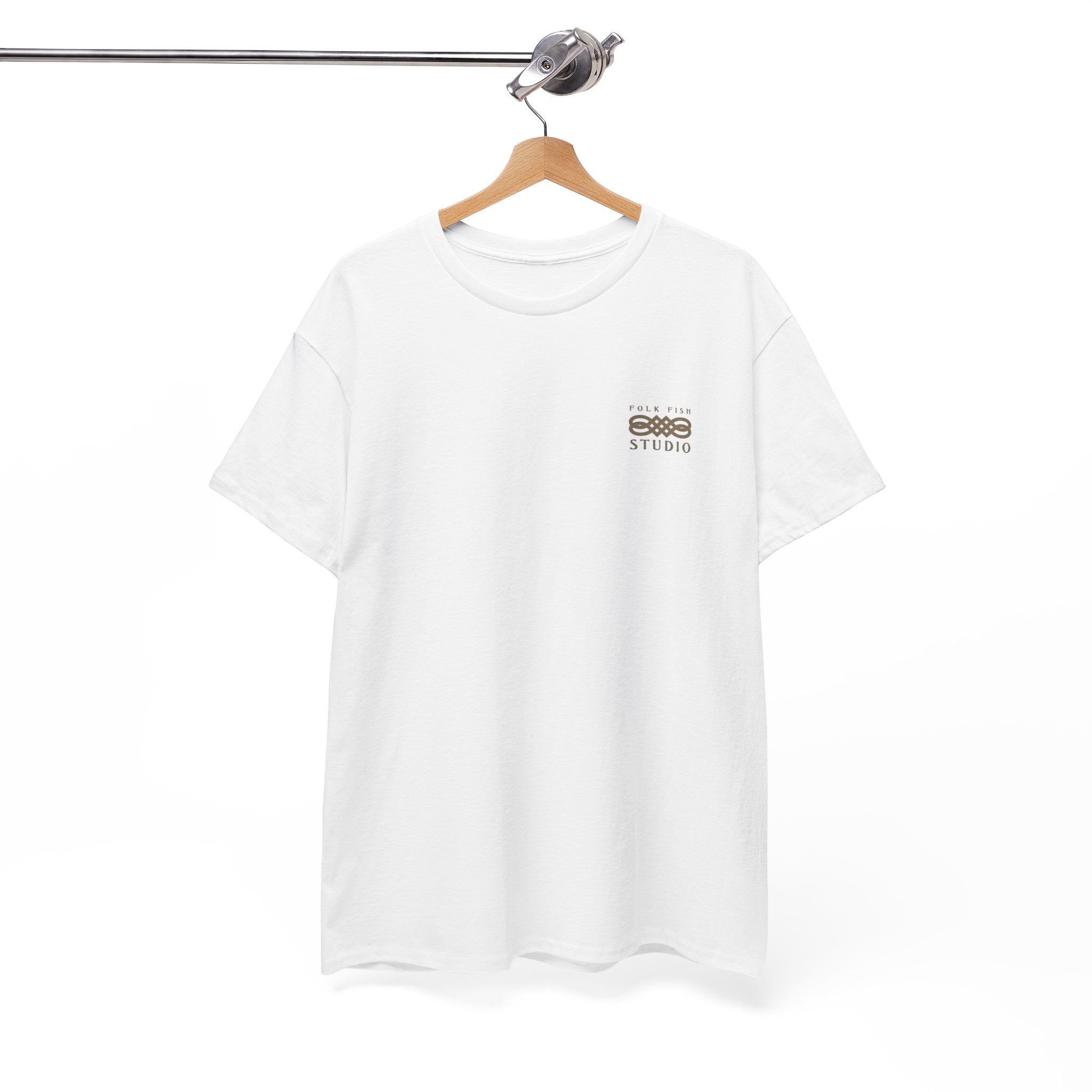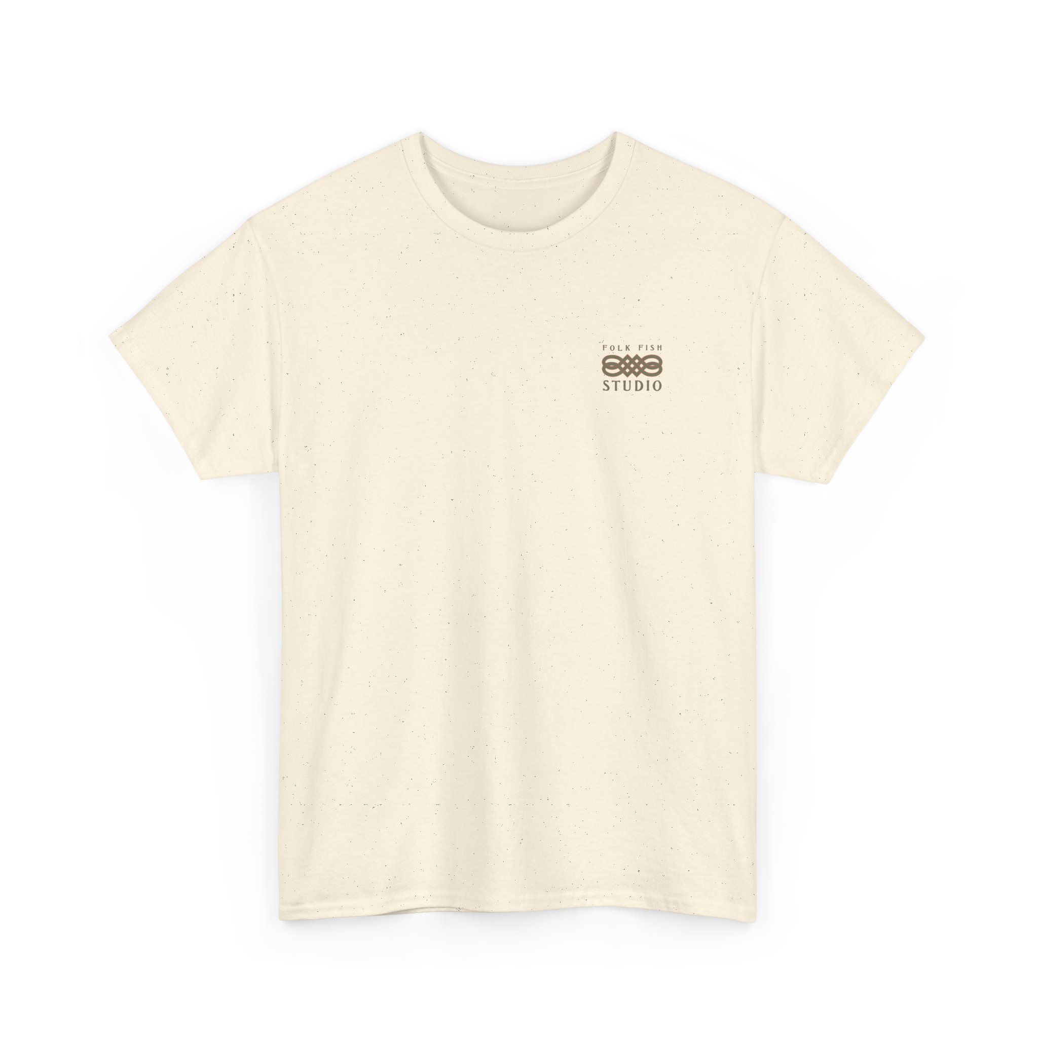 Soft, sturdy, and quietly expressive — this classic cotton tee carries a calm, lakeside spirit. The front keeps things subtle with a small chest mark, while the back opens into a muted, painterly fish and arched studio name that reads like a note from a slow morning on the water. It wears like a reliable friend: breathable, slightly structured, and built to stay true after many washes. Slip it on for sketching, gear sorting, or a relaxed day of casting lines. The restrained palette and timeless silhouette let the artwork take center stage without shouting for attention.